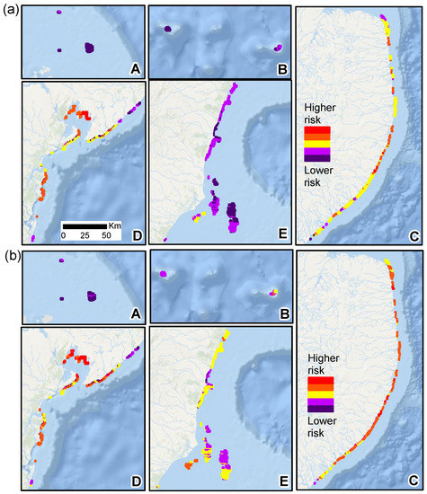 Spatial distribution of the risk to cumulative impacts across reef cells disregarding (a) or considering (b) variable sensitivity to stressors (fishing, land-based activities, coastal development, ocean mining, aquaculture, shipping movements, and thermal stress). The gradient of colours indicates five classes of risk to cumulative impacts ranging from the relatively very low risk in purple to very high risk in red. Panels (A–E) correspond to the locations of five geographically distinct sectors showing in Figure 1.
