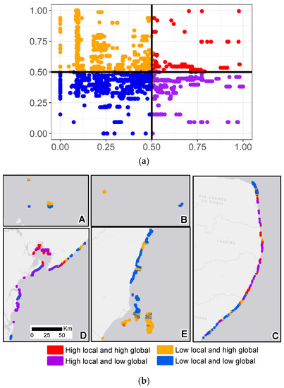Given the pervasive spatial patterns of stressors, it was surprising that a considerable number of reef cells (i.e., about 42%) had low risk to cumulative impacts from both local and global sources of stress (bottom left-hand side of the Figure 5a,b). They were mostly nearshore banks situated further south (sector E), but also included few reefs in sector A (Parcel Manuel Luis), B (Fernando de Noronha Island), C (e.g., Parrachos de Rio do Fogo, northern Rio Grande do Norte) and D (Peninsula de Maraú and northern Bahia). Only 6.5% of reef cells identified as having a high risk of cumulative impact overlapped between the two types of stressors (top right-hand side of the Figure 5a,b). We also found a considerable number of reef cells facing high-level risk to cumulative impacts from global stressors only (i.e., about 37%), which might be targeted for specific conservation actions such as biodiversity monitoring. Lastly, about 14.5% of reef cells had high-level risk to impacts solely related to local stressors and could be prioritised for restoration strategies.