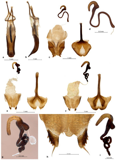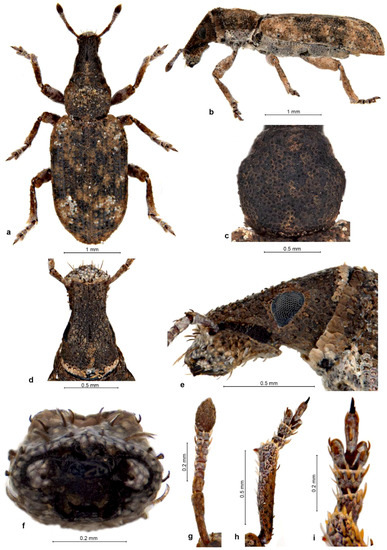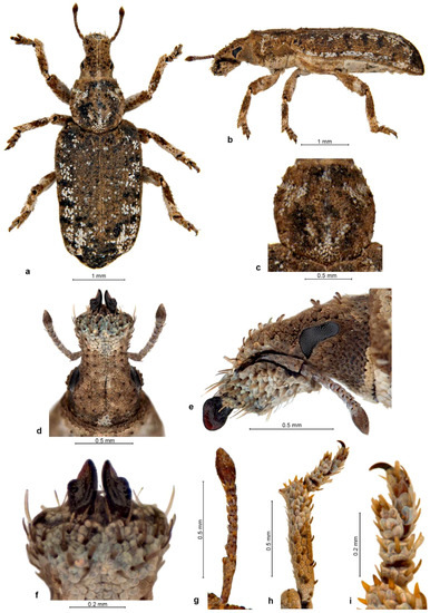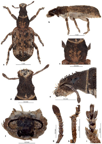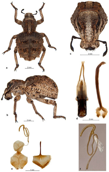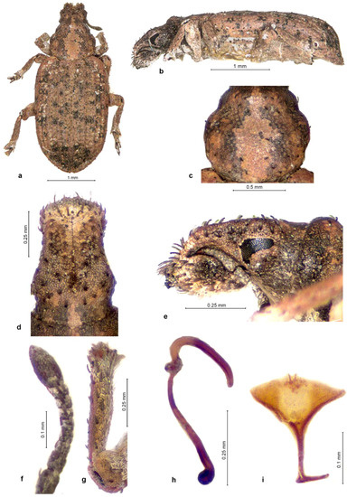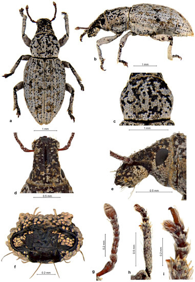 Description. Body length 2.66–4.38 mm, holotype 4.38 mm. Integument black on body, dark testaceous on antennae and tarsi, densely covered with tessellate variegated golden brown and black scales, laterally and posteriorly on elytra admixed with a few white scales arranged in complete or partial rosettes around strial punctures. Rostrum 1.09–1.14× longer than broad, in basal third slightly tapering anteriad, in apical two-thirds widening anteriad; in lateral view moderately long and slender, abruptly declivous in front of antennal insertions. Epifrons dorsally tapering anteriad, sides almost straight, at declivity widening again, with faintly concave sides; disc flat, not impressed but with thin median stria along whole length. Scrobes deeply confluent at back of venter of rostrum. Eyes flat, in dorsal view narrowly visible below broad and raised forehead; in lateral view obliquely subtriangular, with ventroposterior margin straight, slightly raised on weak canthus from posterior and ventral part of head. Antennae with funicle segments subcylindrical to frustocone-shaped, closely approximated; segment 1 almost parallel-sided, 1.2× longer than broad and 1.5–1.6× longer than segment 2; segment 2 isodiametric to 1.1× longer than broad; segments 3–5 1.1–1.2× broader than long; segment 6 1.3–1.4× broader than long; segment 7 1.5× broader than long. Clubs oval, 1.4–1.6× longer than broad. Pronotum 1.03–1.08× longer than broad, broadest before midlength to anterior third, distinctly constricted behind anterior margin, in dorso-lateral view flat or faintly depressed on disc. Elytra together 1.56–1.67× longer than wide, parallel-sided, base deeply emarginate and embracing base of pronotum, broadly rounded at apex; interstriae flat to faintly convex, odd ones only in very short basal part somewhat more elevated than even ones and sutural ones elevated on declivity. Tarsi with segment 2 1.1× broader than long, segment 3 1.3–1.4× broader than long and 1.3–1.4× broader than previous segment, onychium 0.9× as long as segment 3. Genitalia. Penis subparallel-sided, posteriorly weakly attenuate, apex truncate, in lateral view regularly curved, equal in width, in apical third regularly tapered to ventrally placed apex; internal sclerite narrowly to broadly navicular in dorsal view, in lateral view cleft in apical quarter, with dorsal arm as long as ventral one and almost as thick. Gonocoxites flat to shallowly convex, subspatulate, broader in apical half; apex subrectangular, with 1–2 stiff setae; orientated at about 90–135° to each other. Spermatheca with cornu abruptly curved at basal third of its length, then evenly weakly C-shaped, apically inflated (twice thicker than at base) and broadly globular; ramus globular, broadly sessile to shortly stalked; gland elongate, medially constricted, not stalked; collum long but shorter than spermathecal duct, more or less straight but with slight irregular bends along the length, apex bulbous and tightly curled over (insertion of duct rotated 180°); duct stiff, straight to slightly twisted, shorter than spermatheca.