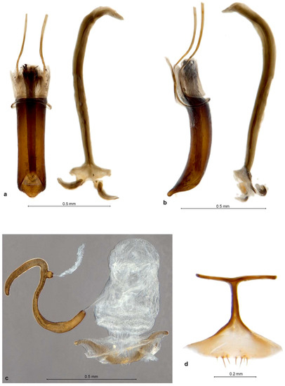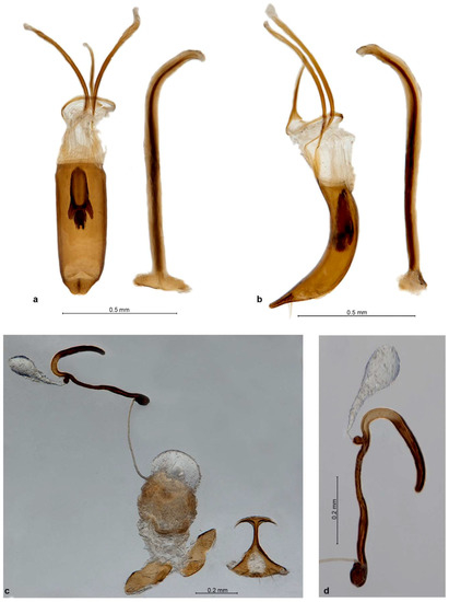 Philetaerobius endroedyi sp. n., genitalia. ♂ (Rooiberg), aedeagus and sternite IX, dorsal view (a); ditto, left lateral view (b); ♀ (Ganakom), ovipositor and sternite VIII, dorsal view (c); ♀ (Ganakom), spermatheca, dorsal view (d).