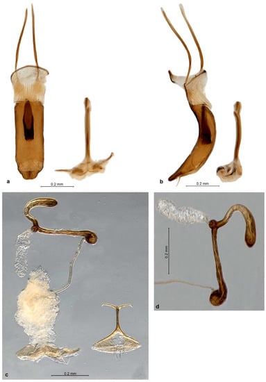 Genitalia. Penis moderately short, well sclerotised, tubular, curved, apex ventrally attenuate, dorsally below ostium with a tuft of two or more long subapical setae; inside in basal half with thick, single but complex sclerite about 0.5× as long as body (Figure 3a, Figure 5a, Figure 7a), in P. garibebi with tubular sclerite as long as body and protruding from base of penis (Figure 9a); temones 1.4–1.7× longer than body of penis and 4× longer than tegminal manubrium. Tegmen with slender ring without parameres, manubrium slightly shorter than diameter of ring. Sternite IX of male with spiculum gastrale moderately long, anteriorly curved and tapered, posteriorly with short, transverse basal plate; sternite VIII consisting of two sickle-shaped, sclerotised hemisternites. Gonocoxites lightly sclerotised, flat, short and broad, roundly subtriangular (in P. garibebi longer and laterally curved outwards), at about right angle to each other, apex with a row of 3–7 stout setae, stylus absent. Sternite VIII of female (Figure 3c, Figure 5c, Figure 7c, Figure 9d) short and broad, basal plate broadly triangular, wider than long, in centre weakly sclerotised, often forming a round fenestra, basal margin thickened and sclerotised, apical margin thin, arcuate, medially usually with 1 pair of long stiff setae (sometimes 2 pairs, and 4 in P. garibebi) and some smaller setae, sometimes medially notched; apodeme about as long as basal plate, conspicuously T-shaped, caput forming a slender transverse rod as long as or longer than stem of apodeme. Spermatheca (Figure 3d, Figure 5d, Figure 7d, Figure 9c) extraordinarily large and conspicuous, well sclerotised; cornu long, variously curved or bent, apically pointed or bluntly inflated; ramus short, subglobular, faintly longer than wide, sessile or on short stem, gland stalked, globular or elongate (in P. garibebi); nodulus not differentiated; collum distinctly longer than cornu, variously curved and twisted, apex usually bulbous and curled so that duct arises next to collum (in P. garibebi not curled and duct arising apically); spermathecal duct stiff, more or less straight, about as long as or shorter than spermatheca, inserted in middle of underside of bursa.
