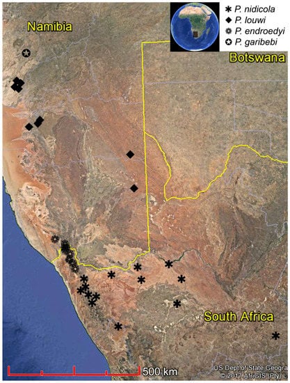 Distribution (Figure 10). The species occurs in the Northern Cape province of South Africa, from Namaqualand eastwards into the Great Karoo, apparently as far east as Hanover (near De Aar). It does not seem to occur north of the Orange River and also not in the Richtersveld; the two localities so-labelled (Buffelsrivier Valley and Haramoep) lie further south, the former west of Springbok and the latter near Goodhouse in the Riemvasmaak Community Conservancy. The distribution range of P. nidicola thus apparently does not overlap with those of P. endroedyi and P. louwi. The implied type locality of the species (“Transkei”, see below) is evidently erroneous as the Sociable Weaver does not occur in this region.