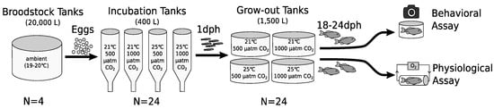 Previous studies have investigated the effects of ocean acidification on marine fishes, finding effects on metabolic rate, behavioral performance, reproductive output, otolith growth, and sensory responses in some species, but not others [9,10,11,12]. More recently, studies have begun to investigate the interacting effects of ocean acidification and warming on marine fishes, finding they may mitigate, reverse, or enhance the effects of elevated CO2. For instance, Domenici et al. [13] found that elevated CO2 and temperature have different and interacting effects on behavioral lateralization in reef fishes, whereas Munday et al. [14] found that elevated CO2 and temperature have additive effects on metabolic rates in two species of cardinalfishes. Other studies point towards temperature having a greater overall effect on ontogenetic development, swimming ability [15], and the outcome of predator-prey interactions [16] compared with elevated CO2. Therefore, it is necessary to consider the interacting effect of warming to properly understand the effects of ocean acidification on fishes and predict outcomes for the future.