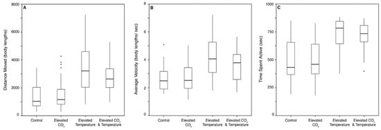 The effect of elevated CO2 and temperature treatments on: (A) the total distance moved, standardized by body length; (B) average velocity, standardized by body lengths; and (C) the time spent active during a 15 min open field test of larval yellowtail kingfish. Boxplots show median and inter-quartile range. N = 29, 38, 29, and 34, respectively.