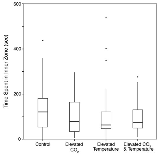 The effect of elevated CO2 and temperature treatments on the time spent in the inner zone during a 15 min open field test in larval yellowtail kingfish. Boxplots show median and inter-quartile range. N = 29, 38, 29, and 34, respectively.