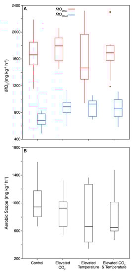 Our physiological trait of interest was metabolic performance, which we approximated by measuring maximal and resting oxygen uptake rates, and calculating aerobic scope, or the difference between these two values. Metabolic traits reveal the energetic requirements of organisms, and are therefore assumed to underpin a range of fitness-related traits [50]. For instance, maximal and resting oxygen uptake rates have been correlated with swimming performance and foraging success in fishes [51,52]. Studies to date show mixed effects of elevated CO2 on maximum and resting oxygen uptake rates in marine fishes [11,53,54]. While few studies have examined the effects of elevated CO2 on metabolic performance in larval pelagic fishes, Pimentel et al. [37] did find a reduction in oxygen uptake rates of mahi mahi upon exposure to 1600 µatm CO2. By comparison, temperature has been well established to affect metabolic traits in marine fishes through its effect on rates of biochemical reactions [55]. Furthermore, a recent meta-analysis [11] indicates that elevated temperature generally has a greater effect than elevated CO2 on metabolic traits of marine fishes.