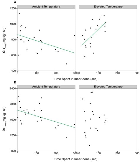 A similar relationship between O2Max and boldness was also detected, with bolder individuals having a lower O2Max at ambient temperature, but the relationship disappeared under elevated temperature. The links between O2Max and behavioral traits have been relatively understudied, and there are no models to explain the underlying causes of such patterns. However, O2Rest and O2Max have shown correlations in fishes [88], suggesting that the similar relationships that we saw between O2Rest and O2Max with boldness are plausible.