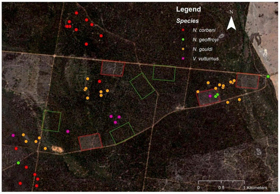 Data loggers in the centre of each of two thinned plots provided preliminary data on time spent in these plots by radio-tagged bats. Data logged for two individuals (one lactating N. corbeni and one lactating N. gouldi) over 4–5 nights in 2017 revealed that both individuals spent >25% of the logged period per night (~6.5 h due to battery drainage) in the thinned plot in which they were captured. Each bat was only logged in the thinned plot (37 ± 1% and 26 ± 9% of the logged period for N. gouldi and N. corbeni, respectively) in which it was captured and roosted approximately 0.4 km (N. gouldi) and 1.3 km (N. corbeni) from the centre of their plot. Bats captured in other thinned plots were not recorded on either logger.