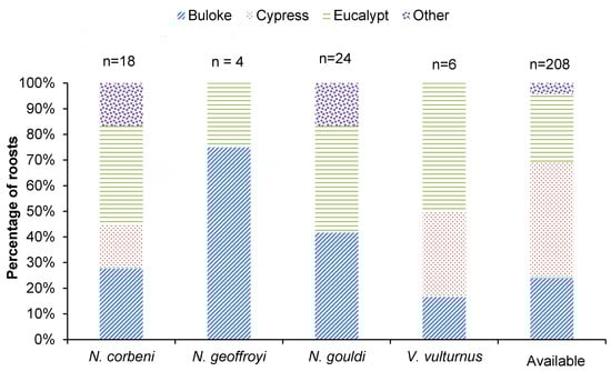 Buloke and eucalypts together represented more than two-thirds of roost trees for each species (Figure 2), and these were typically dead (>75%). For N. corbeni, living and dead eucalypts represented most roost trees followed by dead buloke, dead cypress and other unknown dead trees. Only a small number (n = 4) of N. geoffroyi roosts were located before transmitters were detached. Three roost trees were located in buloke, whereas one individual roosted in a living Pilliga box Eucalyptus pilligaensis in a riparian zone on the forest-paddock interface <1 km from the capture site. For N. gouldi, roosts were equally spread across dead buloke and living and dead eucalypts, with a small percentage of dead tree roosts unable to be identified to species. Dead eucalypts represented most roost trees of Vespadelus vulturnus, with dead buloke and cypress also used (Figure 2).