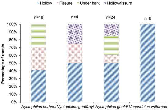 For all species, ≥50% of all roosts were located in a hollow or a fissure (Figure 3). Nyctophilus corbeni and N. gouldi also roosted under bark (Figure 3). Vespadelus vulturnus roosts were exclusively in hollows (Figure 3).