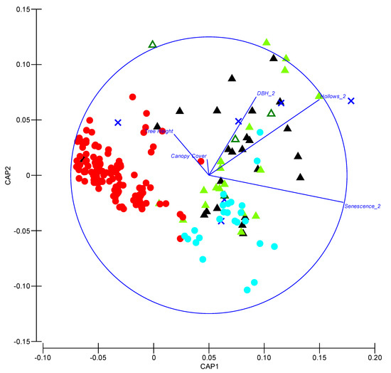 A canonical analysis of principal coordinates (CAP) was used to examine and contrast characteristics of trees used for roosting and those available in the local neighbourhood around roost trees. Prior to analysis, a square-root transformation was applied to continuous variables (tree DBHOB and height), and all data were then normalised. A resemblance matrix (Euclidean distance) was constructed, and a CAP analysis was undertaken. Vectors representing tree characteristics were overlaid onto the CAP output. CAP analyses were conducted using the PERMANOVA+ add-on package in Primer 6 (PRIMER-E Ltd., Plymouth, UK; [54]).