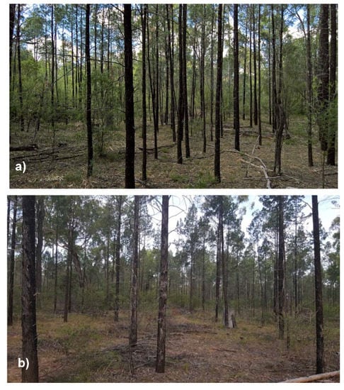 The study was undertaken in Pilliga West State Forest (−30°44′45′’, 149°6′41′’) in the Brigalow Belt South bioregion of northwest New South Wales (NSW), Australia. The area experiences a hot and dry climate, with the mean annual rainfall for nearby Baradine being 633 mm (1944–1998). The Pilliga area has a long history of European use, and consequently, considerable changes to forest structure have been inferred. It has been suggested that much of the Pilliga area was originally open woodland with a similar plant species composition to today [45,46]. However, the extent of areas with differing tree density and its patchiness generally remain unknown. Increasing tree density is thought to have displaced sheep grazing ventures in the 1800s. Forest management for timber began in 1877, and the first local forestry office opened in 1911 [47]. Natural Callitris regeneration over this time appears to have been strongly influenced by a combination of reduced burning, introduction of rabbits and interactions with drought and flood years.
