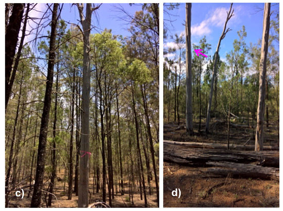 Photographs illustrating the density of small stems (<10 cm DBHOB) in (a) unthinned control sites, (b) thinned sites, (c) areas around roost trees used by N. corbeni and N. gouldi and (d) areas around roost trees used by N. geoffroyi and V. vulturnus located in thinned sites. Pink flagging tape (c) and the arrow (d) indicate the roost tree.