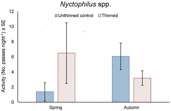Mean total nightly activity ± SE of Nyctophilus spp. in unthinned and thinned treatments in spring 2016 and autumn 2017.