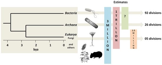 Estimates of the number of microbial species present in the three domains of life. Bacteria are the oldest and most biodiverse group, followed by Archaea and Fungi (the most recent groups). It is estimated that on the planet there are 3 million species of living organisms [11], but strangely, the number of microorganisms has been estimated at 1 trillion [30].