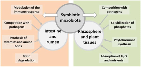 Functional roles played by the symbiotic microbiota in animals and plants, demonstrating the importance of the animal-microorganism and plant-microorganism relationships, which go far beyond the pathogenic role of some strains.