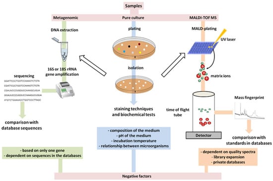 Although molecular methods are faster and more accurate than conventional methods of microbial taxonomy in determining the composition of communities, great progress in the rapid identification of microorganisms has been made by the use of the proteomics technique MALDI-TOF MS (matrix-assisted laser desorption ionization time-of-flight mass spectrometry), which enables diagnosis within 5 to 15 min [120]. This technique consists of the use of mass spectrometry, in which the microbial colony is initially placed on a plate with a polymeric matrix (Figure 3). This biological material is then irradiated with a laser that vaporizes the sample, ionizing several molecules that are aspirated into a vacuum tube and led to a detector. Different molecules have different times of arrival at the detector (time of flight), which are plotted onto graphs, generating several peaks. A specific graph is constructed for each bacterial or fungal species, and a computerized database interprets and provides fast identification results [121]. MALDI-TOF MS is a highly precise method for bacterial classification and identification [122,123], but has as limitation, as it can be applied only to microorganisms already cultivated. The approach may identify low-abundance bacteria, even in mixed flora, although the identification performance of MALDI-TOF MS depends on the number of available mass spectra with the quality required for identification [124]. The expansion of species libraries and the increase in the number of species spectra are crucial for maximizing identification efficiency [125]. This expansion is occurring as the technique becomes popular. However, a disadvantage of this technique is the private nature of these databases. This is not the case with nucleic acid databases, which are public and therefore easily accessible. Notwithstanding, this technique is already the standard method of identification of microorganisms grown in most clinical laboratories in Europe and has excellent popularization prospects in the Americas and in Asia [126].
