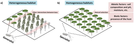 Development of habitat specialization in microbial species. More heterogeneous or disturbed environments tend to be occupied by generalist species (a), whereas specialist species tend to develop in more homogeneous or constant environments and are determined by natural selection (b).