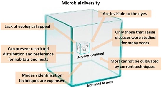 Despite all current knowledge on microbial diversity, we believe that additional evidence may result from long-term studies conducted in unexplored sites, especially those located in high-diversity areas, such as the tropics and marine ecosystems. Molecular studies have revealed a vast and unknown speciation, primarily in the Bacteria and Archaea domains, which comprise the underexplored microbiota. Efforts such as the large-scale sequencing of environmental samples may contribute to a clearer picture of the number of microbial species the planet harbors, but how long will it take to unravel the microbial diversity of the planet? According to Blackwell [243], the molecular tools in use and under development will allow for the discovery of the world’s unknown fungi in less than 1000 years; for bacteria and archaea, estimates must be far higher, revealing the mountain of work still ahead of us. The challenge now is to train microbiologists and to adapt research laboratories to operate molecular techniques, although perhaps the greatest difficulty is the access to these techniques. The known microbial diversity can be thought of metaphorically as a small box within a large box that is able to house a much larger number of microorganisms, i.e., the estimated microbial diversity (Figure 5). However, several factors affect the small box, preventing the disclosure of the contents of the large box, and as predicted by Amann [72], many microbiologists continue to wonder anxiously “Who else is out there?”