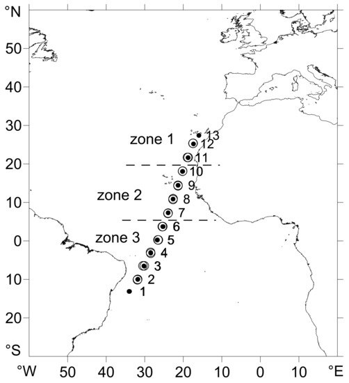 In this study, the food sources and trophic diversity of epipelagic and mesopelagic plankton in the tropical and equatorial Atlantic were investigated using stable carbon and nitrogen isotopes. The differences found in the zones sampled in this study are consistent with the surface productivity regimes, in agreement with previous descriptions of the same cruise [30,32], and entail marked differences in the trophic resources available within each zone. Stations in zone 1 were affected by the northwest African upwelling and by the high salinity of the Canary Current. These oceanographic features favored high productivity in surface waters related to high inputs of nutrients. Zone 2 had the characteristics of strongly stratified tropical waters, with low productivity and phytoplankton biomass in the surface, but a relative increase in phytoplankton fluorescence near 50 m depth near the equator. In zone 3, thermohaline stratification was high in the upper 200 m, particularly in the southernmost stations, with very low phytoplankton and seston concentrations and a weak fluorescence maximum that deepened to the south of the equator. These characteristics, along with the change in the mode of central waters found between 200 and 500 m in the region north of the equator [30], justify the separation of these zones adopted in this study. The observed changes in stable isotope composition of seston and plankton are consistent with the differences in productivity and likely in the phytoplankton composition between these zones The enrichment in heavy carbon isotopes (that is, less negative δ13C values) found in seston and zooplankton in zone 1 is indicative of the dominance of diatoms [14], also characteristically associated with phytoplankton blooms induced by the upwelling [24]. In contrast, low δ13C values of the same compartments in the tropical and equatorial zones agree with the dominance of picophytoplankton and other non-diatom phytoplankton groups in these waters [36]. For instance, δ13C values for seston fractions dominated by picophytoplankton (0.7–2 µm) were 2–3‰ lower than those dominated by diatoms (2–64 µm) in the western Mediterranean [37]