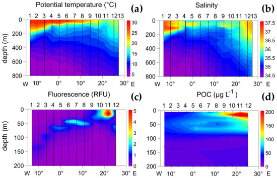 The sampled transect was characterized by marked thermohaline stratification, with high surface temperature, deep fluorescence maxima, and low POC concentrations in most stations (Figure 2). The exceptions were the northernmost three stations (particularly St. 11) with surface temperature values below 20 °C and high surface fluorescence and POC.