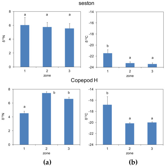 The mean ± SE (a) δ15N and (b) δ13C of seston and herbivorous copepods (Copepod H) in the epipelagic layer (surface to 200 m) for the three zones marked in Figure 1. Different letters indicate significantly different zonal means (ANOVA and Dunnett-C post hoc tests, p < 0.05).