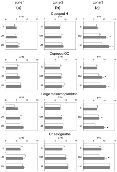 The mean (± se) δ15N of plankton guilds (H: herbivores, OC: omnivores-carnivores) for the epipelagic (E, 0–200 m), upper mesopelagic (UM, 200–500 m), and lower mesopelagic (LM, 500–900 m) layers in (a) zone 1, (b) zone 2 and (c) zone 3 for day (white bars) and night (grey bars) samples. Asterisks indicate significant differences (ANOVA, p < 0.05) between day and night samples at each layer.