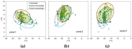 The similarity between isotopic niches, indicated by the overlap between the corresponding ellipses, was highest in case of the upper and lower mesopelagic layer of zone 2, and lowest for the epipelagic and upper mesopelagic layers of zone 1 (Table 2). Minimum overlap (< 50% of the non–overlapping area) was found between the epipelagic and upper mesopelagic layers in all zones. There was a moderate overlap (34 to 47%) between the epipelagic and lower mesopelagic layers. In contrast, the overlap between the upper and lower mesopelagic layers was always high (> 50%) in all zones.