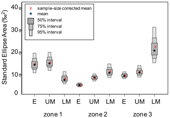 The standard ellipse areas for the food webs observed in the epipelagic (E), upper mesopelagic (UM), and lower mesopelagic (LM) layers of the zones marked in Figure 1 computed from the Bayesian multivariate normal distributions fitted to the original isotope data. The uncorrected (black dots) and sample–size corrected mode values (red crosses), along with the intervals encompassing 50%, 75%, and 95% of the estimations (shaded boxes) are indicated.