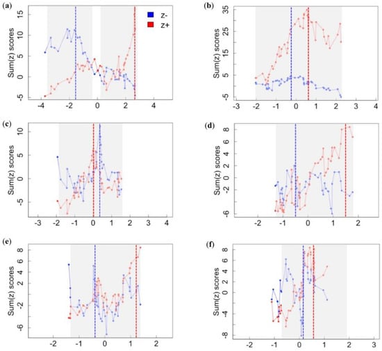 Congruence in change-point location among species in a response group (i.e., negative or positive) was used as evidence of assemblage-level thresholds, with an assemblage threshold for each response group. IndVal scores were used to identify assemblage thresholds, with scores standardized to z-scores to facilitate cross-species comparison []. Species were grouped according to the direction of their response: z− group had a negative response and z+ group a positive response. IndVal scores for the z− and z+ scores at each point along the gradient were summed. The negative and positive assemblage thresholds correspond to the value along the gradient where the sum(z−) or sum(z+) scores showed a distinct peak, respectively. Strong responses by multiple species to the same gradient value result in a distinctly sharp peak with large sum(z) scores, whereas weak responses result in lower sum(z) values without a distinct peak []. Uncertainty around the estimated assemblage thresholds was assessed by bootstrapping the original data and recalculating the change-points, and is expressed as confidence limits (i.e., quantiles of the change-point distribution).