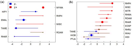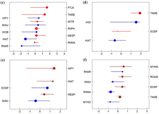 Species-specific change-points along environmental and human disturbance gradients. Species that exhibited a significant response (p < 0.05) to a respective gradient are shown: (a) landscape disturbance, (b) cave complexity, (c) mining, (d) cave development, (e) resource extraction, and (f) bat hunting, with each species’ corresponding threshold represented by circles. Blue circles represent ‘losing’ species (z−) with corresponding species labels on the left axes (see Table S2 for details) and red circles correspond to ‘winning’ species (z+) with corresponding species labels on the right axes. Circles are sized in proportion to the magnitude of each species’ response (based on z-scores), with overlapping horizontal lines representing the 95% confidence limits after 500 replicates. Species are ordered by increasing taxon-specific change-points along gradients, and alternate in order between ‘winners’ and ‘losers’.