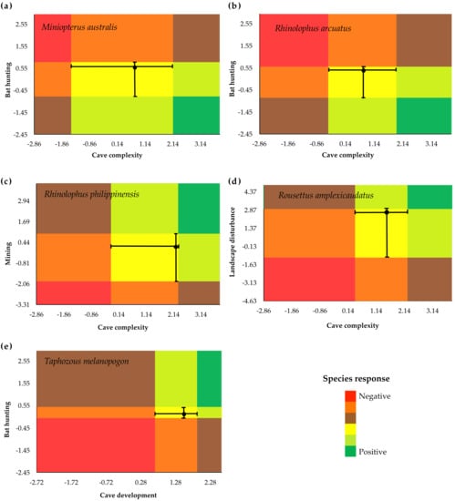 We considered species that exhibited significant responses to a gradient (IndVal scores with p-value < 0.05) and with values for purity > 0.90 and reliability > 0.75 to be credible indicator species. At least one indicator species was identified for each of our gradients (Table S3), with the most indicator species along the gradient of cave complexity (n = 10). Of the 19 species included in our study, 16 species (84.2%) were identified as indicator species for at least one gradient. Five species (Miniopterus australis, Rhinolophus arcuatus, Rhinolophus philippinensis, R. amplexicaudatus and T. melanopogon) were indicators for two gradients (Figure 4, Table S3). Specifically, M. australis and R. arcuatus exhibited mixed responses (Figure 4a–b) while the other three species responded positively to each gradient (Figure 4c–e).