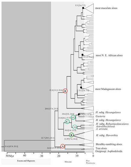 An early divergence of shrubby aloes (or their ancestors) around 16.82 (15.5–22.4) Mya had already been suggested by Holland (1978) [54], who had supposed that these succulents represent the original ancient lineage for other aloes during the desertification of Africa.