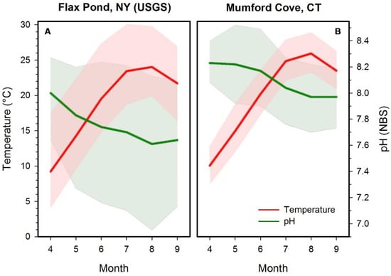 Average mean (+/−minimum/maximum) monthly temperature and pH conditions during the spawning and growing season of Atlantic silversides in (A) Flax Pond, Long Island, New York and (B) Mumford Cove, Connecticut. The sites provided wild spawners for experiment 1 (A) and experiments 2–5 (B). Long-term averages were derived from monitoring data collected in 15 min intervals by (A) USGS station #01304057 between 2008 and 2018 and (B) the Baumann lab in Mumford Cove between 2015–2018.