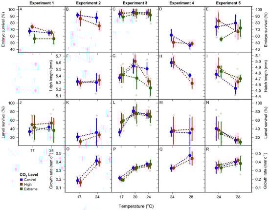M. menidia. Offspring responses to control (blue), high (red), and extreme (green) CO2 conditions at four temperatures across five CO2 × temperature factorial experiments. Traits include embryo survival (A–E), hatch length (F–I), larval survival (J–N) and larval growth rate (O–R). Individual replicates are represented by small faded circles. Treatment means (±SD) are depicted by large, bold circles and connected by dotted lines. Note: different scales used for hatch length measurements due to differences in sample timing; panels F and G use 1dph length Y axis (left) while panels H and I use hatch length Y axis (right).