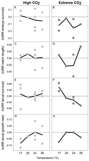 The overall CO2 effect on embryo survival was small in response to high CO2 conditions (within ±0.06) and similar across temperature treatments (Figure 3A). For offspring exposed to extreme CO2, all responses were negative (−0.04 to −0.30), but there was no apparent trend with temperature (Figure 3B). For hatch size, overall effects were small both at high and extreme CO2 treatments (±0.03), again with no apparent temperature dependency (Figure 3C,D). The overall effect of high CO2 conditions on larval survival was highly variable (−0.64 to 0.55) and overall neutral across temperatures (Figure 3E). Interestingly, the effect of extreme CO2 conditions on larval survival was positive at 17 °C (0.42) but became increasingly negative with increasing temperatures (−0.18 at 24 °C and −0.44 at 28 °C, Figure 3F). Average CO2 effects for growth rate were small (within ± 0.10), but exhibited a dome-shaped response across temperatures at both CO2 levels, with negative growth responses at sub-optimal rearing temperatures (Figure 3G,H).