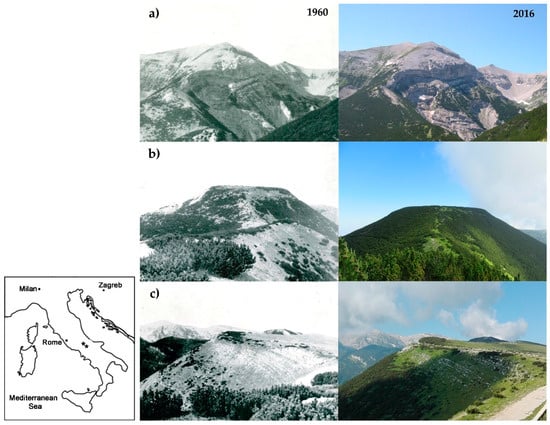 Locations of the study areas in Central Italy along with a photographic comparison of Pinus mugo formations in the years 1960 [57] and 2016 in three localities of the Majella massif: (a) Mt. Cavallo and Mt. Focalone, (b) Blockhaus, and (c) Maielletta. The main changes in the landscape are related to an increase in krummholz density across the treeline ecotone.