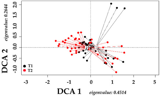 Detrended correspondence analysis using species as the explanatory variables. Black dots represent the relevés sampled in T1 (1992); red dots represent the relevés sampled in T2 (2016/2017); lines (blank and red) link the relevés with the respective centroids (numbered squares 1 and 2).