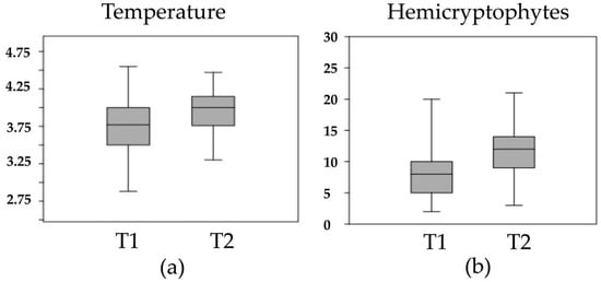 In particular, the post hoc Mann-Whitney U comparisons revealed major differences between the old and new datasets (T1: 1992 and T2: 2016–2017) in the temperature indicator value (T) and the hemicryptophyte life form (H). The median T indicator value increased from 15.68 to 21.8 (Mann-Whitney z = −2.4505, nT1 = 37, nT2 = 37. p = 0.0143), and the H median value increased from 13.77 to 23.73 (Mann-Whitney z = −3.995, nT1 = 37, nT2 = 37, p = 0.0002) (Figure 3). The increase in T was mainly related with an increase in the frequencies of some thermophilic species (Ellenberg T values 4–6).