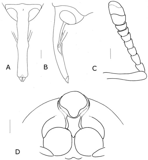 Sclerocardius bohemani Schoenherr: (A) head dorsal (scale bar = 0.5 mm), (B) head lateral (scale bar = 0.5 mm), (C) antenna dorsal (scale bar = 0.5 mm), and (D) prothorax, ventral (scale bar = 1 mm).