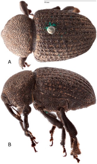 - Lyal, C.H.C. Molytinae Schoenherr, 1832. In Coleoptera, Beetles. Morphology and Systematics. Volume 3. In Handbook of Zoology. Arthropoda: Insecta; Leschen, R.A.B., Beutel, R.G., Eds.; De Greuter: Berlin, Germany; Boston, MA, USA, 2014; pp. 529–570. [Google Scholar]