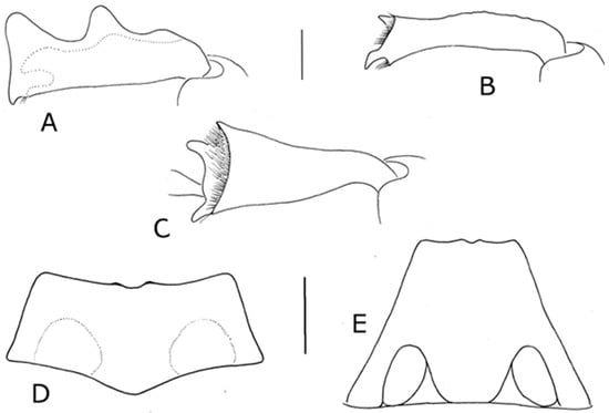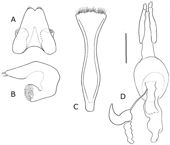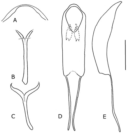 Male terminalia. Sternite VIII narrowly sclerotised along posterior margin (Figure 17A). Spiculum gastrale Y-shaped, simple (Figure 17B). Tegmen (Figure 17C) with apodeme longer than width of ‘ring’, slender. Penis (Figure 17D,E) body weakly sclerotised dorsally, lack anteriad ventral lobe; ostium diagonal with respect to longitudinal axis of penis; endophallus with pair of oval toothed sclerites not near gonopore.