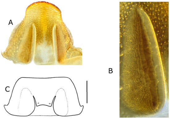 Sclerocardius kuscheli sp.nov., tergite VII: (A) female, dorsal, (B) female showing wing-binding patch, and (C) male, dorsal (Scale bar = 0.5 mm).