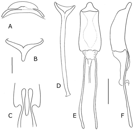 Male genitalia. Sternite VIII with two very weakly sclerotised lobes posteriorly, anterior of sclerite smoothly concave (Figure 8A). Spiculum gastrale Y-shaped, simple (Figure 8B). Tegmen with apodeme short, asymmetric (Figure 8C). Penis (Figure 8D–F) with body three-quarters the length of its apodemes, penis body length more than 2.6 times its maximum width; fully sclerotised; dorsally weakly concave; sides weakly convex anteriorly; ostium almost at right angles to long axis of penis body; small ventral projection anteriorly, anterior ventral margin with anteriad lobe, partially sclerotised (Figure 8F); endophallus with small cornet-shaped sclerite near gonopore