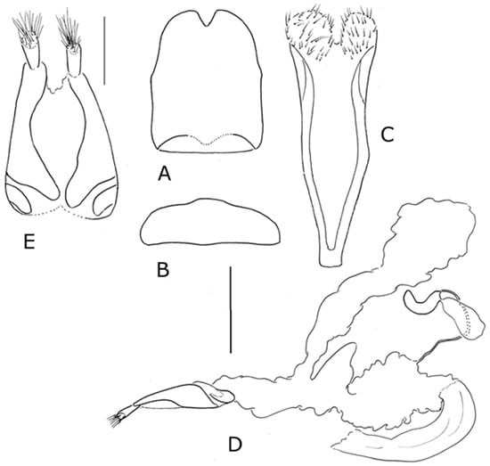 Female genitalia. Tergite VIII (Figure 9A) with posterior margin abruptly emarginate medially; approximately one-third as deep as wide (Figure 9B). Spiculum ventrale with posterior arms separate for two-thirds of length, with large membranous pouch between them, apodeme distinct anteriorly; posteriorly with numerous setae (Figure 9C). Gonocoxites entire, lacking median unpigmented area (Figure 9D). Vagina and bursa lacking pigmented area around junction with common oviduct and spermathecal duct; common oviduct and spermathecal duct arising separately from ventral membranous lobe of vagina (Figure 9E).