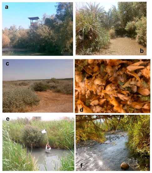 A chain of three lakes formed at the bottom of a tectonic depression stretches along the Jordan Valley: the freshwater Hula Lake, the Sea of Galilee (=Yam Kinneret), and the extremely saline Dead Sea (=Yam haMelah). The shallow Hula Lake (14 km2) surrounded by the Hula swamp (30–60 km2, depending on the precipitation in any particular year) was once exceptionally rich in flora and fauna, until it was drained in the 1950s in order to eradicate malaria and to release land for agriculture. The drainage dessicated the lake and its surroundings, resulting in the loss of most of its biota, with some of the animal and plant species completely disappearing and populations of the remaining species strongly reduced [,,,]. Currently, 3.2 km2 comprise the Hula Nature Reserve (Figure 3a–d) with its remnants of the natural vegetation, while 8–10 km2 belong to the artificially flooded Agmon haHula, where attempts are being made to reintroduce the natural biota [,,]. The Sea of Galilee (170 km2) is the largest freshwater body in Israel. Its shores suffer strongly from human activities (urbanization, agriculture, tourism) and from a lowering of the water level as a result of dessication. The natural vegetation has remained relatively untouched in only a few preserved areas along its east-northern edge. Most of its coast is now either cultivated or features monocultural stands of Arundo, Phragmites, or Tamarix. The Dead Sea (605 km2) features extremely halobiontic conditions. The salinity of its water reaches 35%, and no multicellular organisms can survive in it, although soldier fly larvae (Diptera: Stratiomyidae) have been reported, probably having drifted in with the freshwater flow []. Its shores too are strongly saline. In recent years the water level in the Dead Sea has been receeding, and the shores are drying out and crumbling, which strongly affects the coastal flora and fauna.