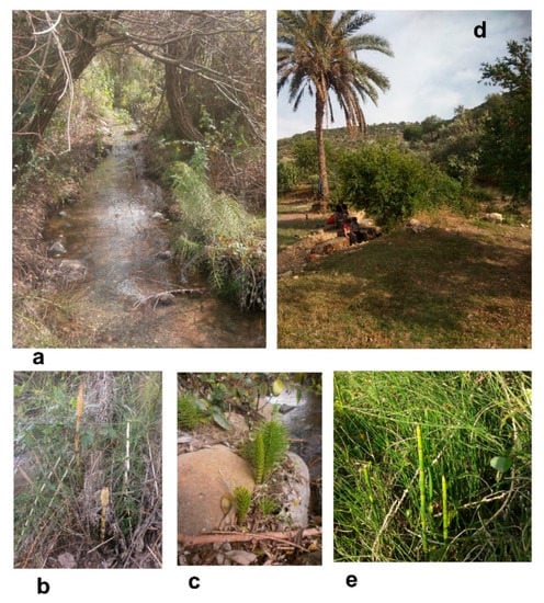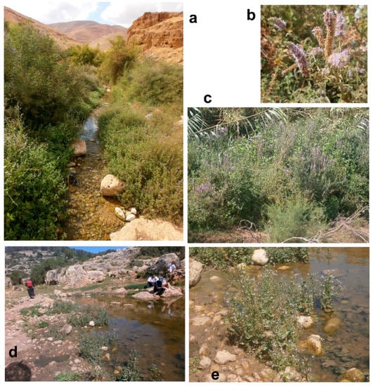 (a) ‘En Peza`el, Nahal Peza`el, Jordan Valley, Mentha longifolia, Vitex agnus-castus, Ziziphus spina-christi; (b) same place, blooming Mentha longifolia; (c) Arik Bridge, bank of the Jordan River, Lythrum salicaria, Melilotus albus, Phragmites australis and Tamarix sp.; (d) Nahal Qana, Turtles Pond, Samarian Hills, Veronica anagallis-aquatica growing along the water; (e) same place, Veronica anagallis-aquatica.