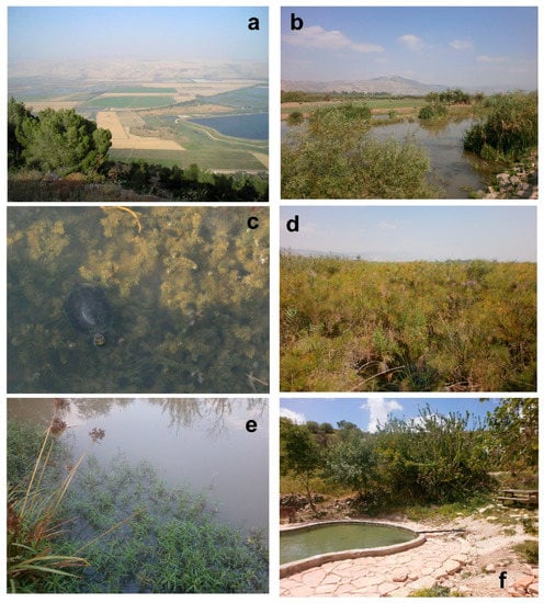 (a) Hula Valley, cultivated part, seen from Naftali Hills, E Upper Galilee; (b) Hula Nature Reserve; (c) Hula NR, Ceratophyllum demersum; (d) Hula NR, Cyperus papyrus, Lythrum salicaria; (e) Park haYarden, bank of the Jordan River, Persicaria decipiens, Cyperus sp.; (f) ‘En ‘Amassa spring at the foot of Mt. Gerizim, Samarian Hills, cultivated.