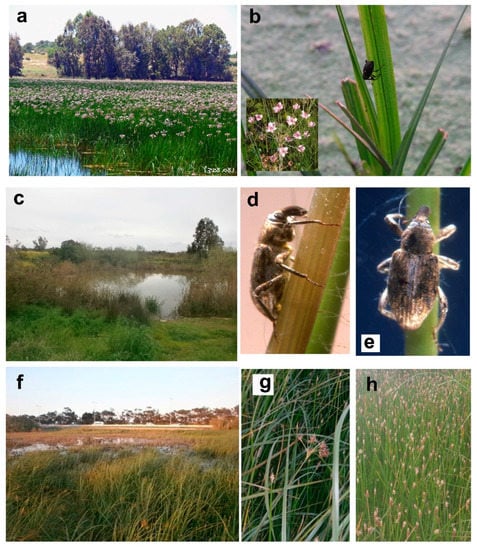 (a) Berekhat Ya’ar, Central Coastal Plain, Butomus umbellatus blooming (courtesy Noam Avitzel); (b) same place, Bagous validus feeding on Butomus umbellatus (courtesy David Furth), on smaller photograph flowers of B. umbellatus; (c) ‘En Nimfit Nature Reserve, Migdalit haNehalim Pond, vernal pond; (d) Picia syriaca, lateral view, photographs taken in lab, Tel Aviv University (courtesy Amikam Shoob); (e) same, dorsal view (courtesy Amikam Shoob); (f) Ga’ash Winter Pool Nature Reserve, vernal pool, Eleocharis palustris and Scirpus maritimus; (g) same place, Scirpus maritimus; (h) Nizzanim Dunes Nature Reserve Roberts’ Pool, vernal pool, Eleocharis palustris.