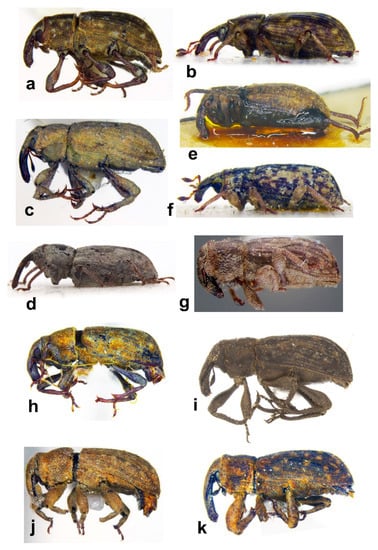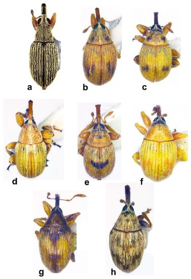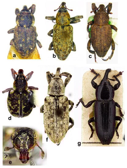 - Caldara, R.; Franz, N.M.; Oberprieler, R.G. 3.7.10. Curculioninae Laterille, 1802. pp. 589–628. In Handbook of Zoology. Arthropoda: Insecta; Coleoptera, Beetles. Vol. 3. Morphology and Systematics (Phytophaga); Leschen, R.A.B., Beutel, R.G., Kristensen, N.P., Beutel, R.G., Eds.; Walter de Gruyter: Berlin, Germany; Boston, MA, USA, 2014; p. 675. [Google Scholar]